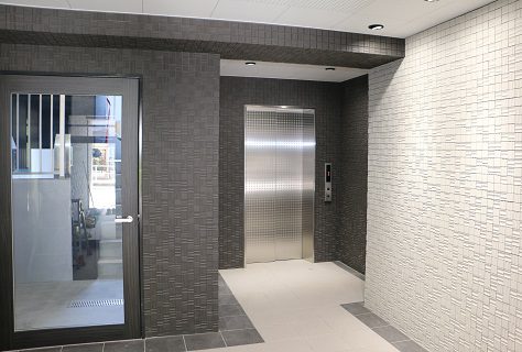 エントランスホールです。床はLIXILの300角タイル貼り、壁はLIXILの47.5角タイル貼りです。